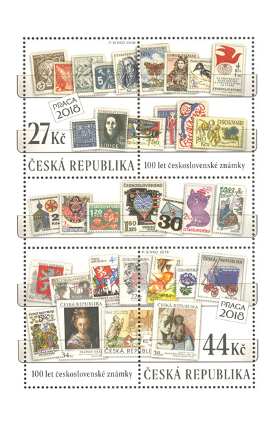 Celé jedno století nás v letošním roce dělí od vydání prvních československých poštovních známek. Těmi byly výplatní známky s obrazem Hradčan Alfonse Muchy. Česká pošta toto jubileum připomíná představením příležitostného poštovního aršíku, který je tvořen soutiskem dvou různých známek a tří kupónů. Poštovní aršík vychází 20. června 2018.