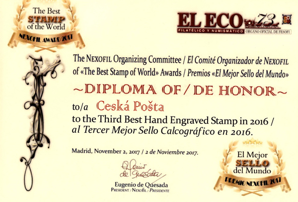 Zástupci České pošty převzali ve čtvrtek 2. listopadu 2017 na Světové soutěži poštovních známek za rok 2016 v Madridu ocenění za třetí nejkrásnější poštovní známku v kategorii „Ručně rytý ocelotisk“. Ocenění získala příležitostná poštovní známka z cyklu „Umělecká díla na známkách: František Tichý (1896 – 1961)“. V soutěži byly zastoupeny nejen iberoamerické a španělšké známky, ale i známky Evropy, Japonska a USA.