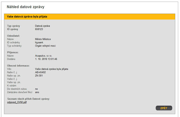 Náhled datové zprávy umožní zobrazit obsah datové zprávy a stáhnout vložené přílohy, a to i v případě, že na počítači není nainstalovaný doplněk 602XML Filler, který je nutný v případě, že používáte k práci s datovou schránkou webový portál. Bez doplňku totiž nejsou k dispozici některé důležité informace, týkající se zabezpečení datové zprávy, jako je časové razítko a elektronická značka.