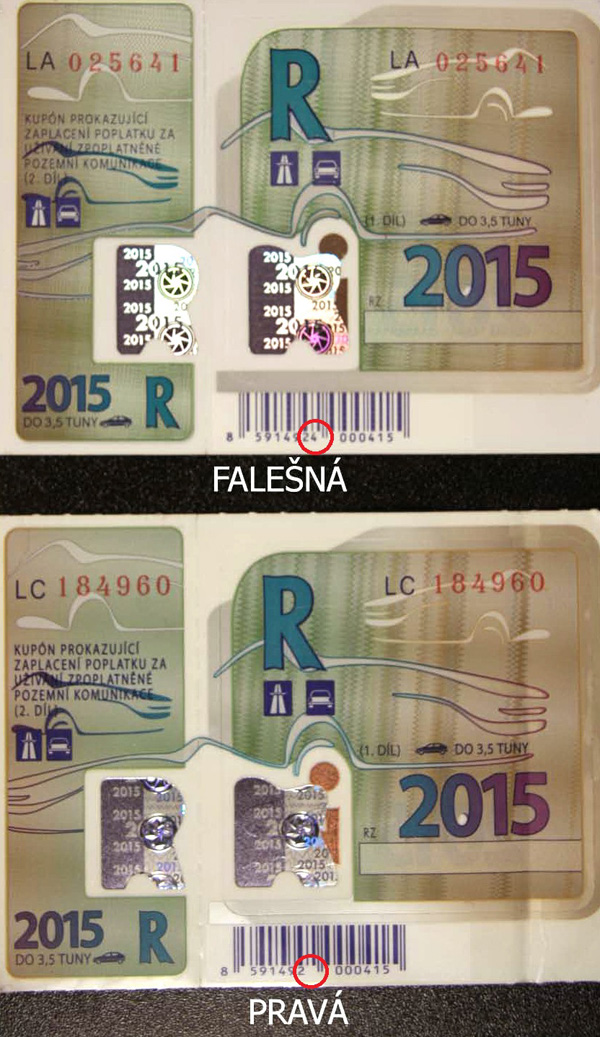 Vzor originálního dálničního kupónu a padělku s vyznačenými změnami: