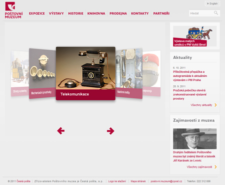 Web je členěn do šesti sekcí: expozice, výstavy, historie, knihovna, prodejna, kontakty, partneři. V expozici najdeme Poštovní muzeum Praha, v kterém jsou biedermeierovské Navrátilovy salonky a dále je zde Česká, Československá a světová známková tvorba.