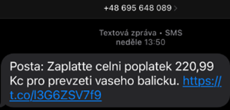 Česká pošta opět varuje zákazníky před podvodnou SMS zprávou, která předstírá, že byla odeslána z České pošty. Informuje zákazníka, že má zaplatit celní poplatek/je vyžadováno clo. Částka: 220.99 Kc. Je uveden odkaz na platbu.
