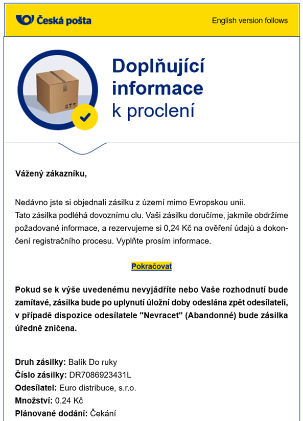 Česká pošta opět varuje zákazníky před podvodným e-mailem, který předstírá, že byl odeslán z České pošty. Informuje zákazníka, že se jim nepodařilo doručit jeho zásilku. Tato zásilka podléhá dovoznímu clu. Jeho zásilku doručí, jakmile obdrží požadované informace. Rezervují si 0,24 Kč na ověření údajů a dokončení registračního procesu.