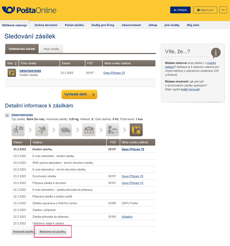 - Přes aplikaci “Sledovat zásilku“ na webu České pošty, s.p. se po vyplnění podacího čísla zásilky objeví možnost reklamovat (tlačítko „Reklamovat zásilku“).