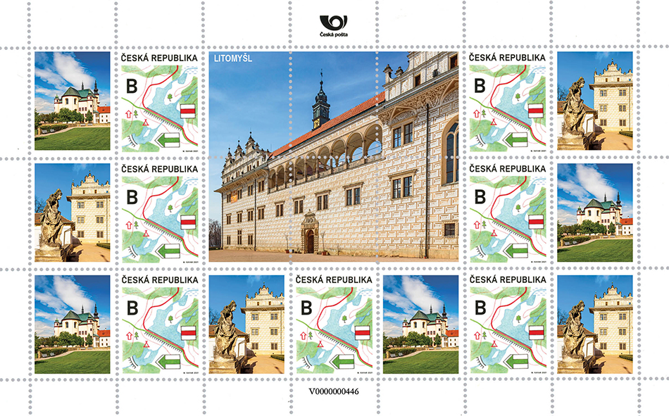 Námět – kombinace tří různých motivů s tématikou Litomyšle. Konkrétně se jedná se o kupóny s kostelem Nalezení sv. Kříže, který je součástí klášterního areálu, vystřídané kupóny s jednou ze souboru barokních soch antických božstev z výzdoby zámecké zahrady. Ve středu tiskového listu dominuje zámek (památka UNESCO).