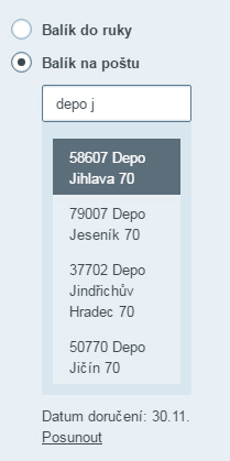 - Do pole pro výběr napište depo a počáteční písmeno města, kam zásilku směřujete. Např. posíláteli zásilku na Depo Jičín, zadejte „Depo j“.