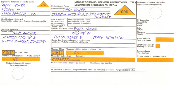 Odesílatel vyplní „Mezinárodní dobírkovou poukázku" a předá ji poště společně s poštovní zásilkou.