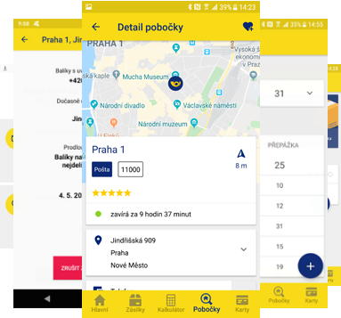 Zajímá vás, kterou poštu máte nejblíže, jaké služby nabízí nebo za jak dlouho zavírá? Nejbližší pobočky se zobrazují automaticky včetně vzdálenosti v km. Pošty můžete dále filtrovat např. podle služeb nebo otevírací doby. Vybranou poštu lze zobrazit na mapě nebo se k ní nechat jednoduše navigovat. Poštu, kterou navštěvujete opakovaně, si můžete uložit do záložky Oblíbené.